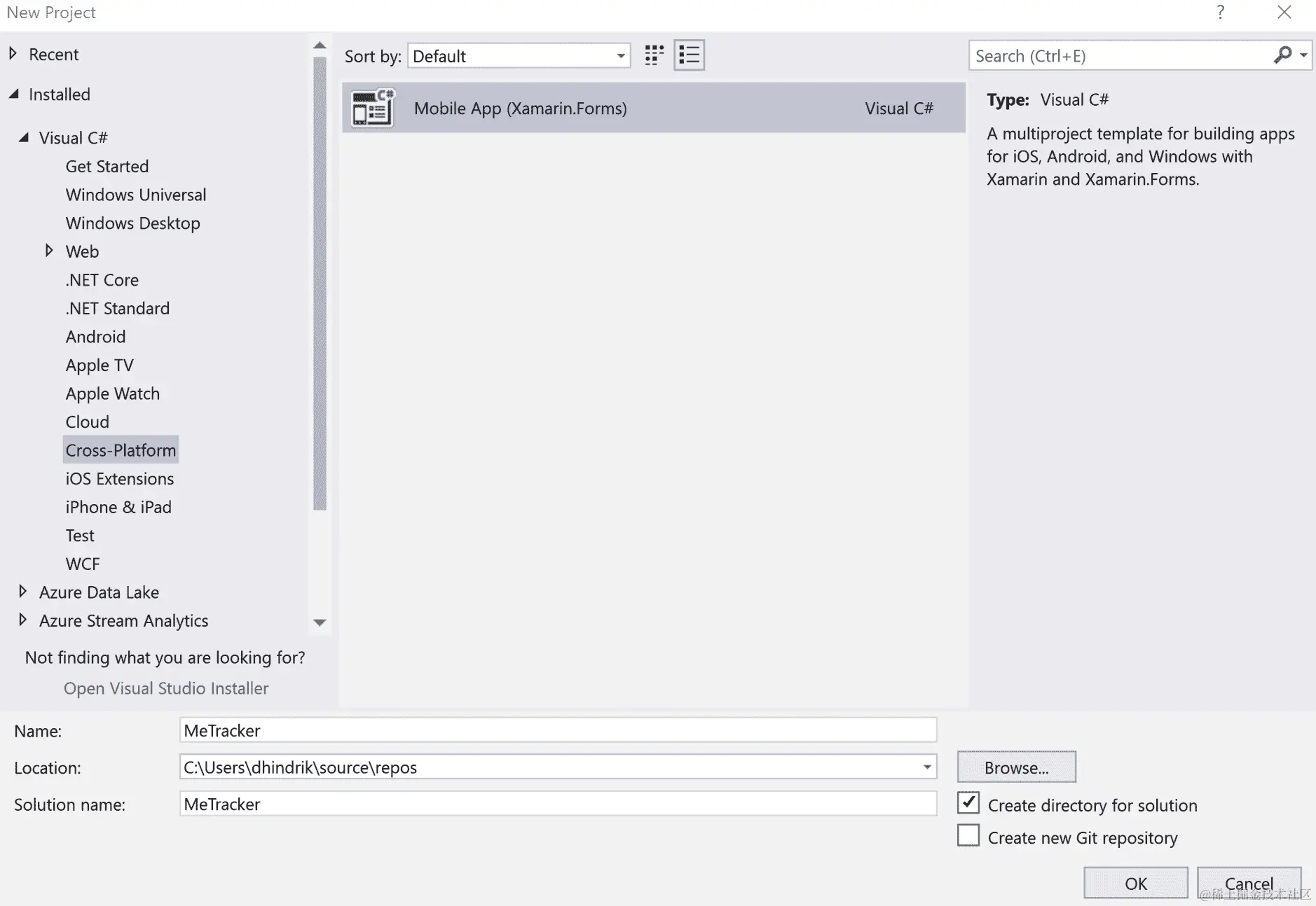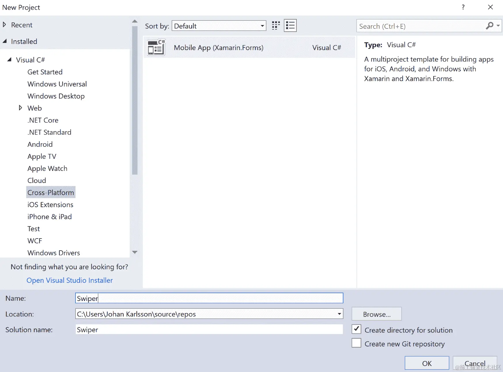 这将打开新项目对话框。展开 Visual C#节点,然后单击跨平台。从列表中选择移动应用程序(Xamarin.Forms)项目。通过为项目命名来完成表单。在这种情况下,我们将称我们的应用程序为Swiper。单击确定继续下一个对话框: