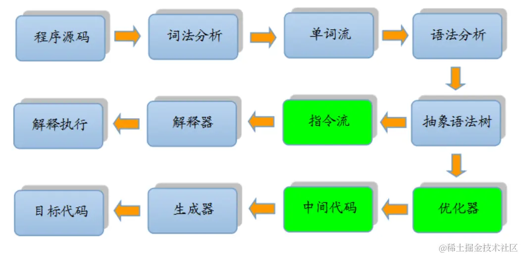 在编译原理中,把源代码翻译成机器指令,一般要经过以下几个重要步骤: