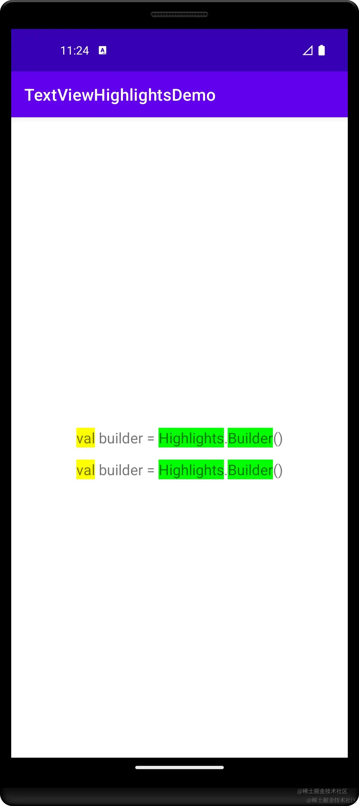 我们通过代码实例演示通过上述两个 Builder API 构建一样的高亮效果,然后通过 TextView 的 setHighLights() 反映。
