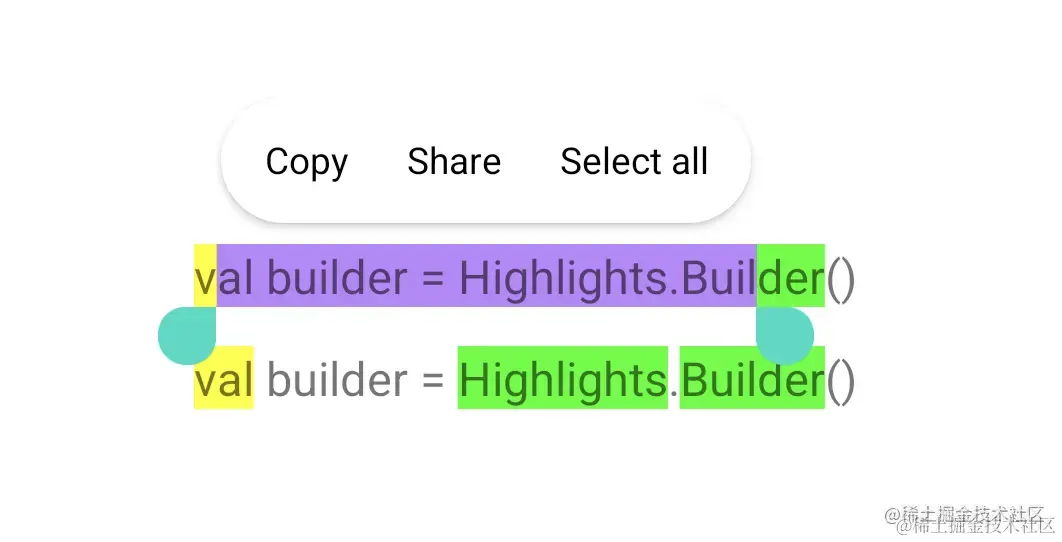 升级 Android 14 后就不用这么迂回了,因其首次引入直接设置高亮的 API:HighLights。需要留意的是 HighLights API 和 Android 1.0 即加入的 textColorHighlight API 不同: