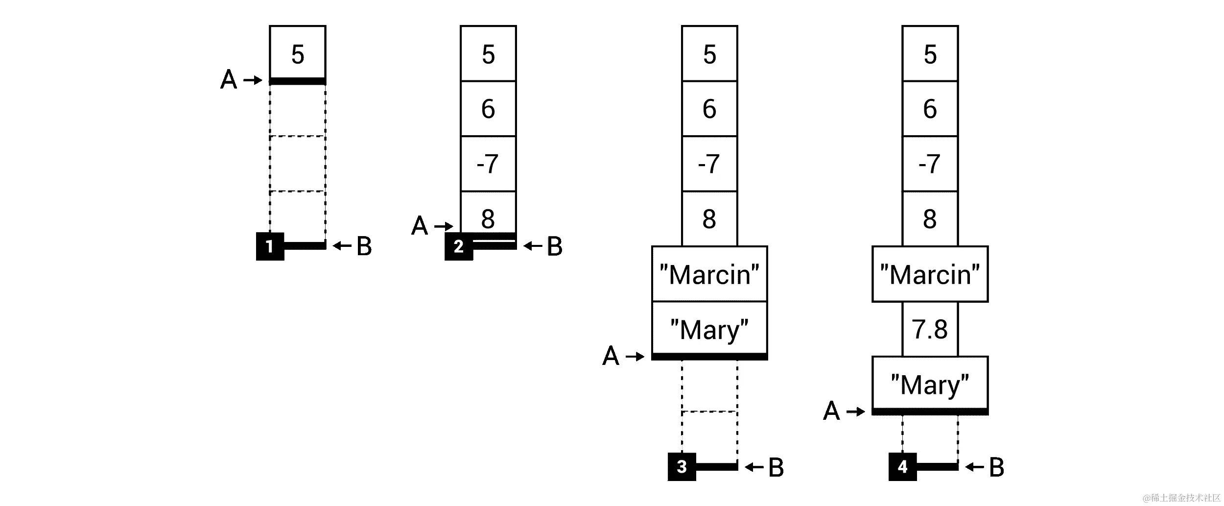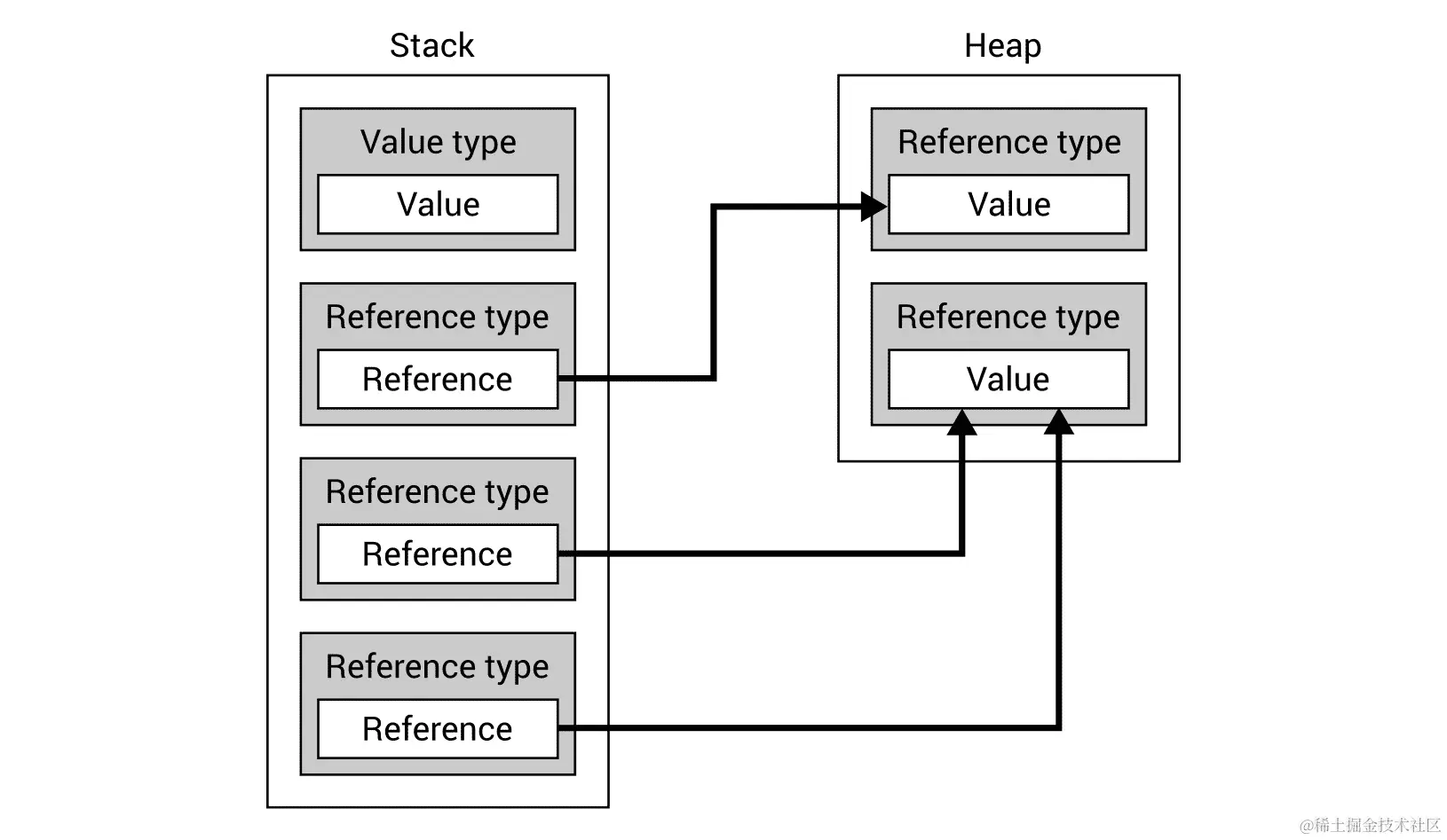 正如您所看到的,值类型直接将其实际值存储在堆栈内存中,而引用类型只在此处存储引用。实际值位于堆内存中。因此,也可能有两个或更多引用类型的变量引用完全相同的值。