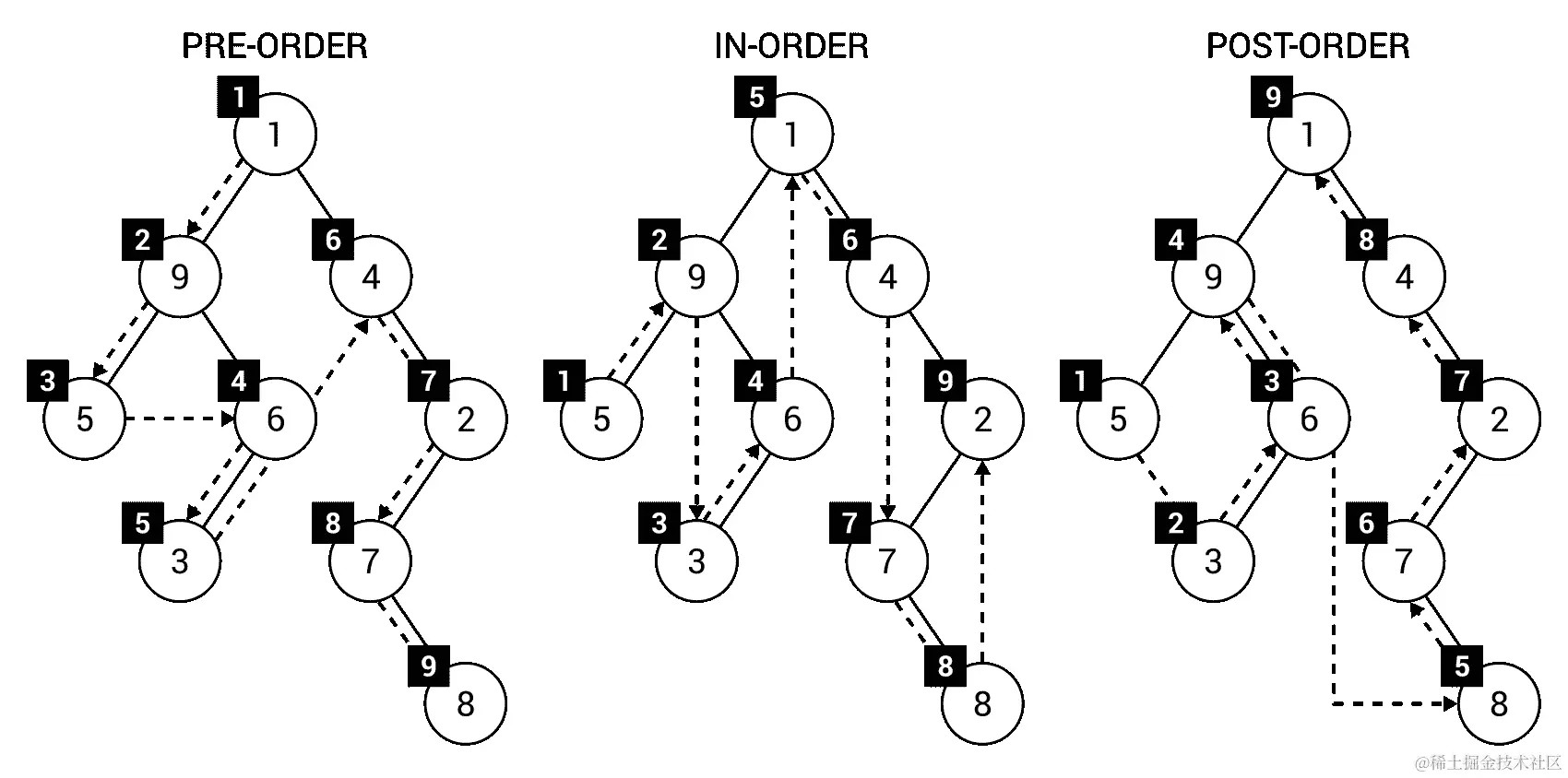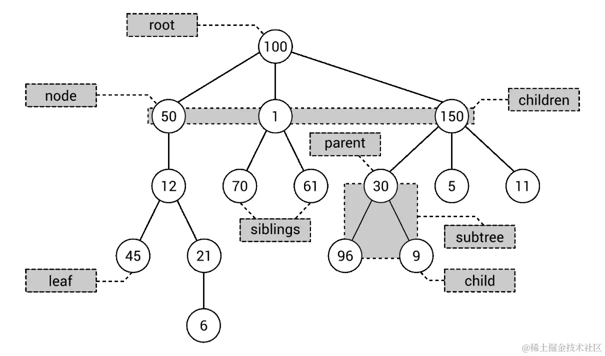一开始描述了树的概念。作为提醒,树由节点组成,包括一个根。根节点不包含父节点,而所有其他节点都包含。每个节点可以有任意数量的子节点。同一节点的子节点可以被称为兄弟节点,而没有子节点的节点被称为叶子节点。