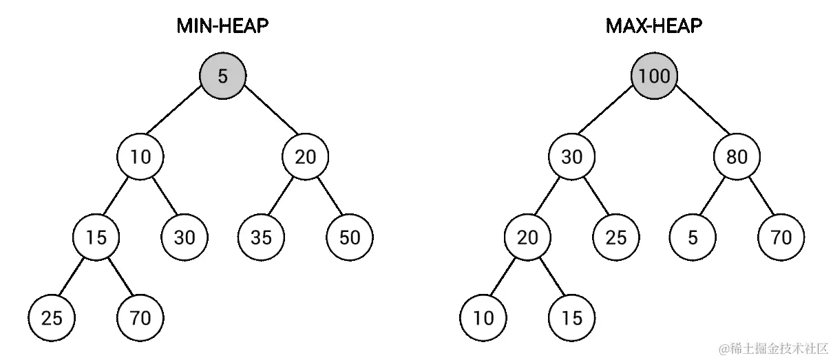堆是树的另一种变体,存在两个版本:最小堆和最大堆。对于它们中的每一个,必须满足一个额外的属性:
