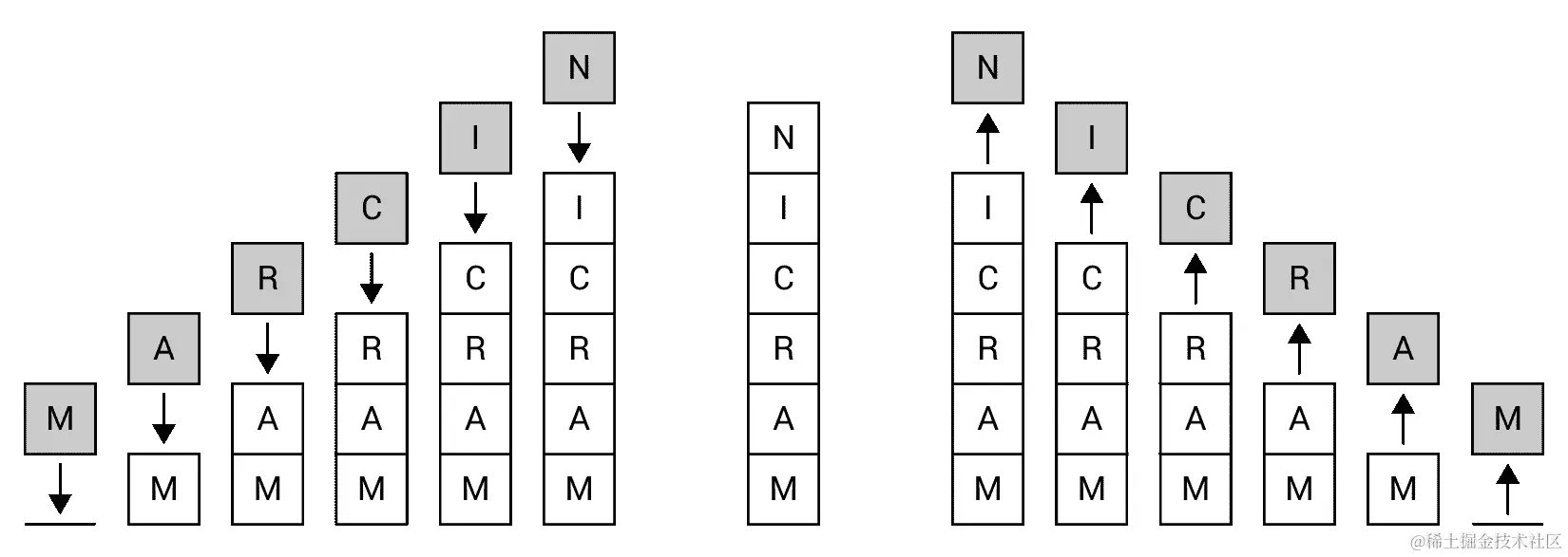首先,让我们尝试使用堆栈来反转一个单词。您可以通过迭代形成字符串的字符,将每个字符添加到堆栈的顶部,然后从堆栈中移除所有元素来实现这一点。最后,您将得到反转的单词,如下图所示,它展示了反转MARCIN单词的过程: