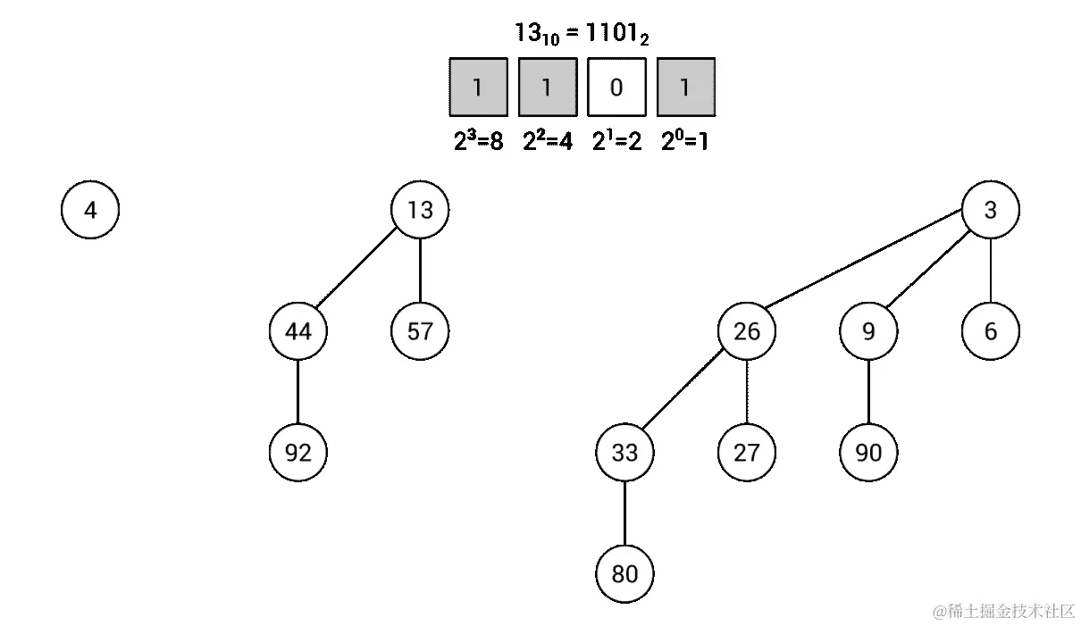 然而,您如何知道二项堆中应该放置多少个二项树,以及它们应该包含多少个节点?答案可能有点令人惊讶,因为您需要准备节点数的二进制表示。例如,让我们创建一个包含13个元素的二项堆。数字13的二进制表示如下:1101,即12⁰ + 02¹ + 12² + 12³。