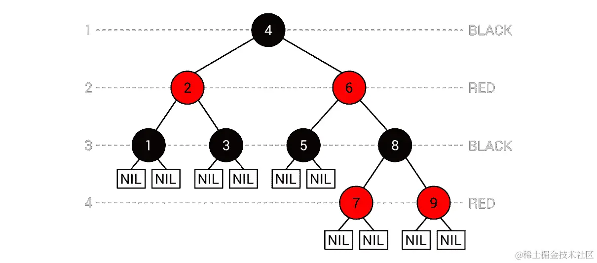 树由九个节点组成,每个节点都着为红色或黑色。值得一提的是 NIL 伪节点,它们被添加为叶子节点。如果您再次查看前面列出的规则集,您可以确认在这种情况下所有这些规则都得到了遵守。