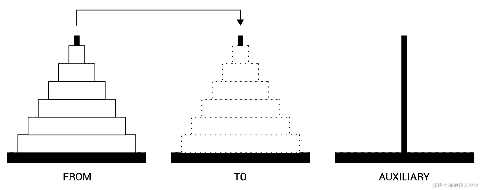 正如您所看到的,您可以通过将n-1个圆盘从FROM移动到AUXILIARY,使用TO作为辅助杆来解决移动n个圆盘的问题。然后,您应该将剩余的圆盘从FROM移动到TO。最后,您只需要将n-1个圆盘从AUXILIARY移动到TO,使用FROM作为辅助杆。