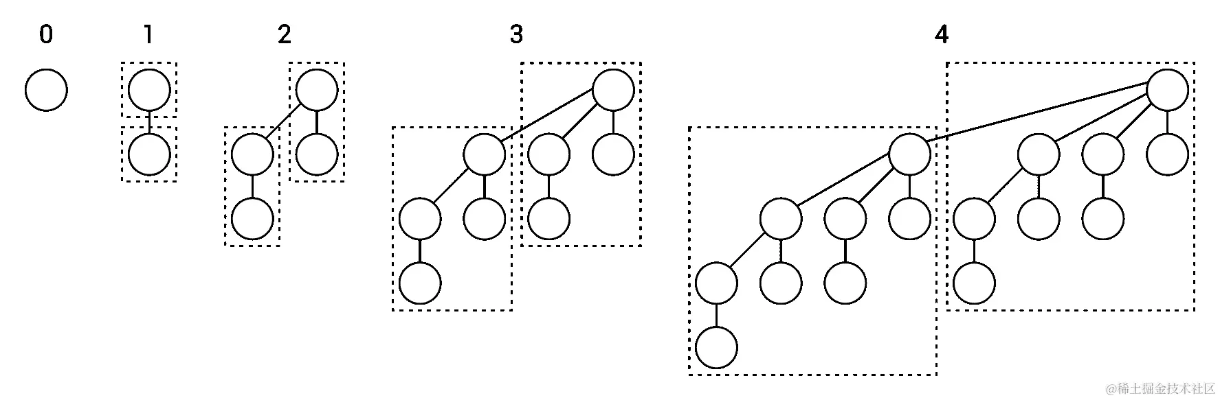 如前所述,顺序为0的二项树只是一个单个节点,如左侧所示。顺序为1的树由两个顺序为0的树(用虚线边框标记)连接在一起。在顺序为2的树的情况下,使用两个顺序为1的树。第二个作为第一个树的父节点的最左子节点附加。以同样的方式,您可以配置具有以下顺序的二项树。