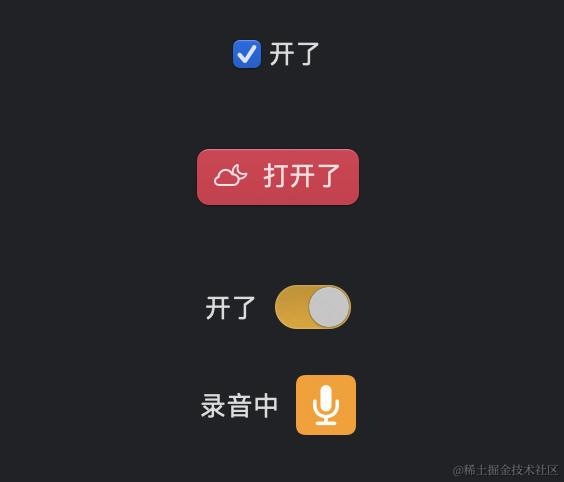 | Toggle | 切换两种状态的开关 | .switch, .botton, .checkbox |