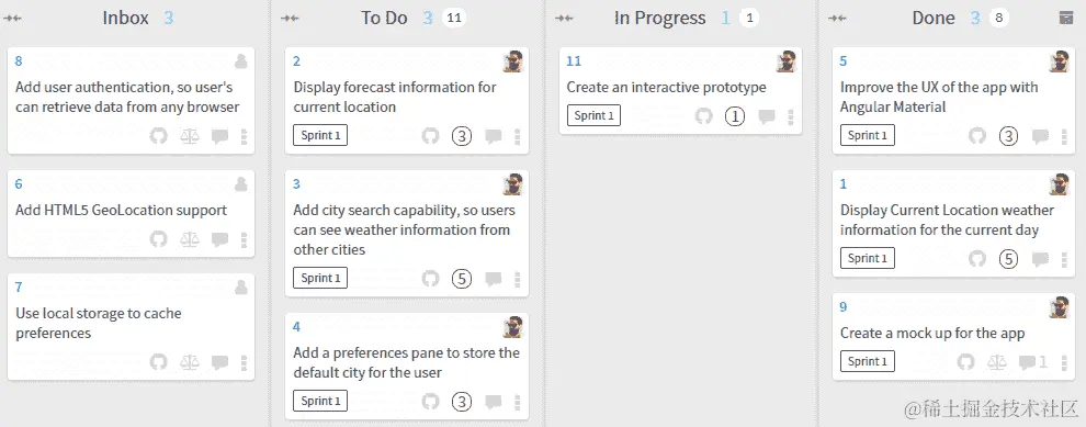 我们首先添加一个新任务来创建一个交互式原型,在任务结束时,我会将所有工件附加到这个任务上,这样它们就存储在 GitHub 上,所有团队成员都可以访问,也可以从 Wiki 页面链接进行持久性文档化。让我们将这个新任务拉到进行中的列,并查看来自 Waffle.io 的看板板的状态: