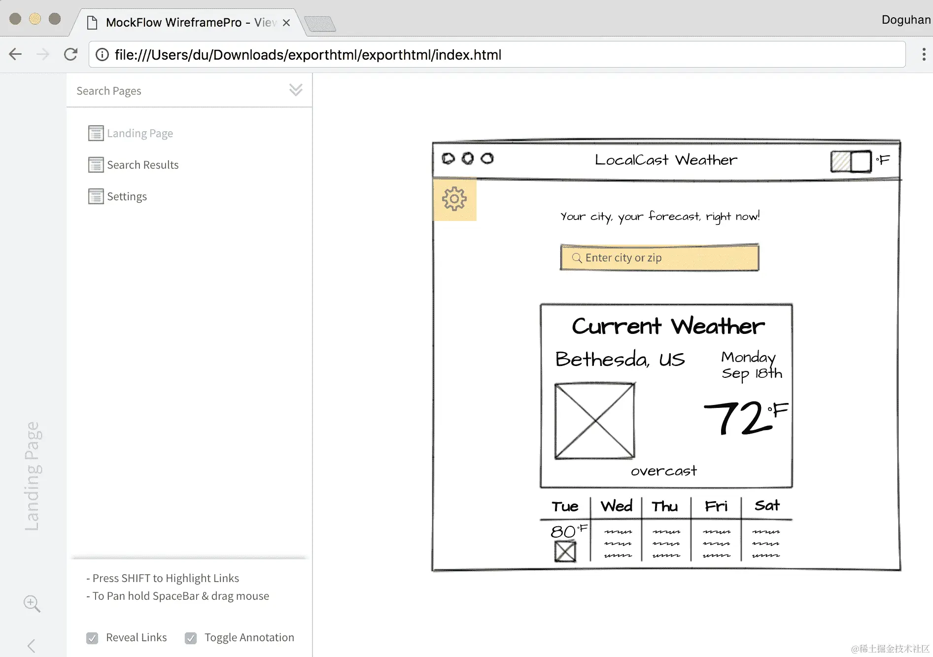 解压捆绑包并使用浏览器导航到它;您应该会得到您线框的交互版本,如图所示: