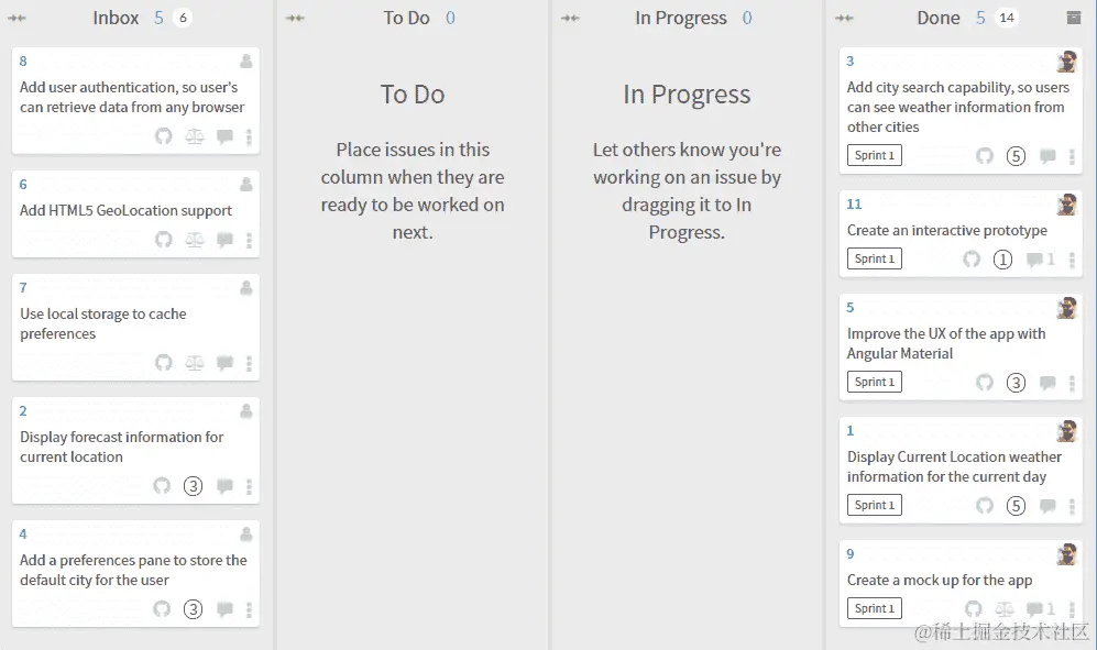 现在将所有资产添加到 GitHub 问题的评论中,包括 ZIP 捆绑包,我们准备继续下一个任务。让我们将“添加城市搜索卡…”移动到“进行中”,如我们看板中所示: