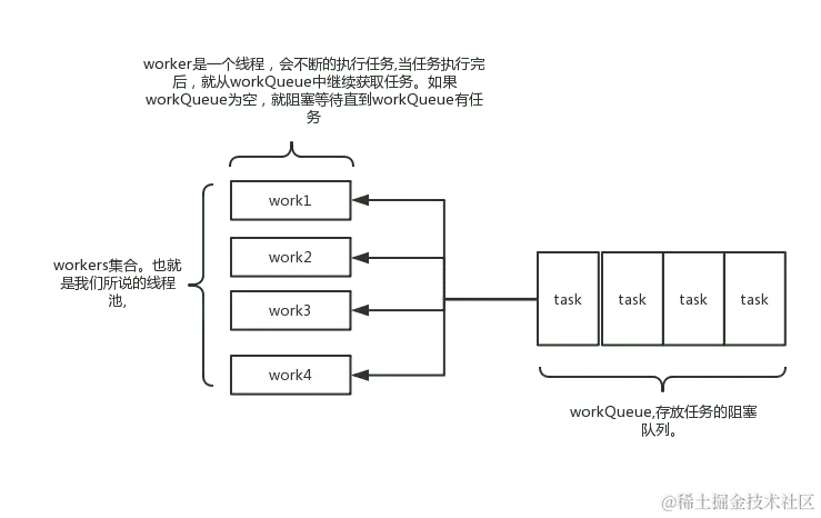 其实java线程池的实现原理很简单,说白了就是一个线程集合workerSet和一个阻塞队列workQueue。当用户向线程池提交一个任务(也就是线程)时,线程池会先将任务放入workQueue中。workerSet中的线程会不断的从workQueue中获取线程然后执行。当workQueue中没有任务的时候,worker就会阻塞,直到队列中有任务了就取出来继续执行。
