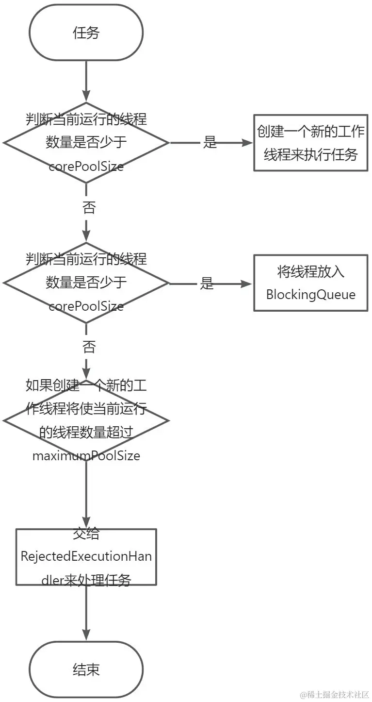 - 如果创建一个新的工作线程将使当前运行的线程数量超过maximumPoolSize,则交给RejectedExecutionHandler来处理任务。