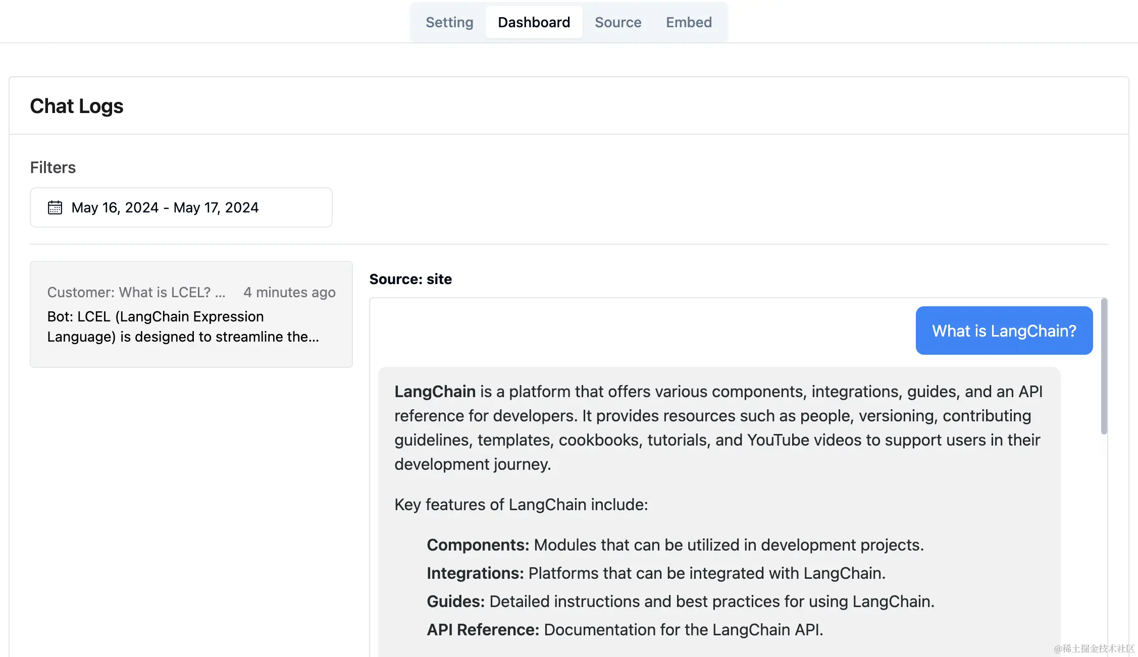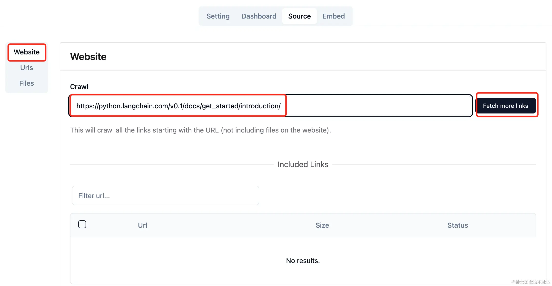 在管理后台切换到source tab,输入LangChain官网地址:https://python.langchain.com/v0.1/docs/get_started/introduction/,