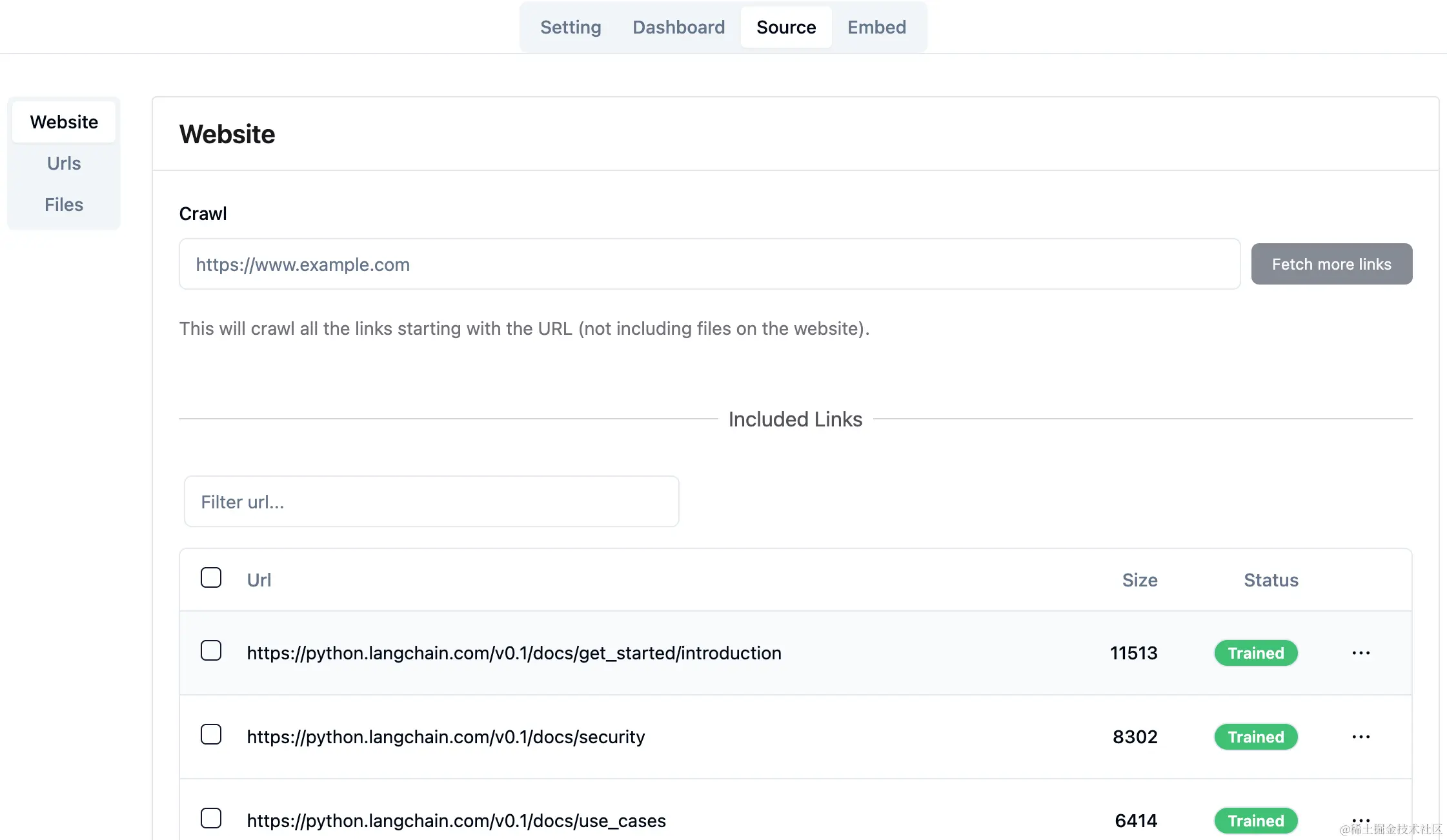 等所有网页URL的文本都被抓取,并且存入向量数据库后,在管理后台上所有网页URL展示的状态都是 Trained 。