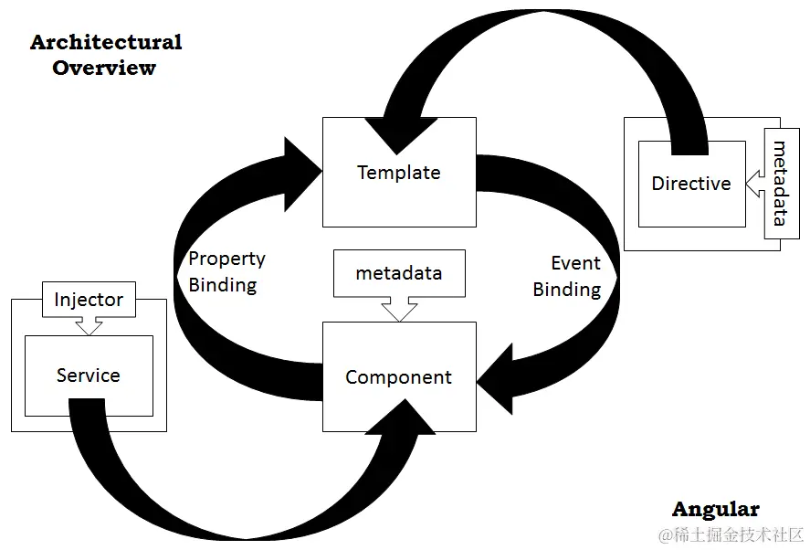 Angular 的架构包括模块、组件、模板、元数据、指令和服务。