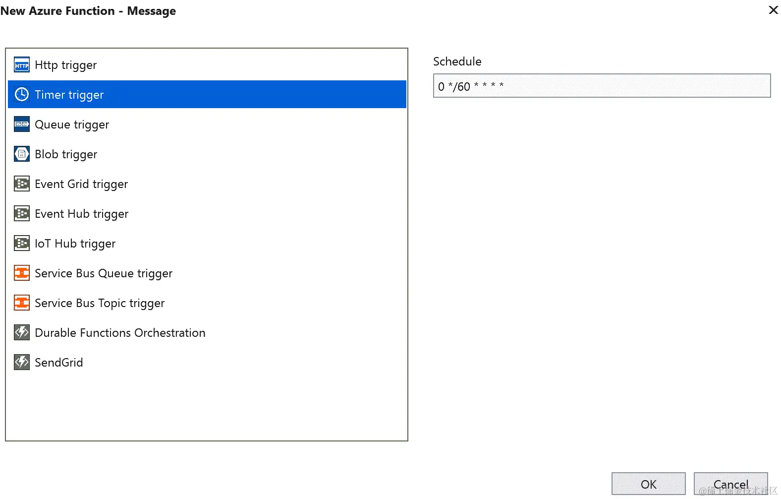 选择函数将使用时间触发器,因为我们希望它按时间间隔运行。