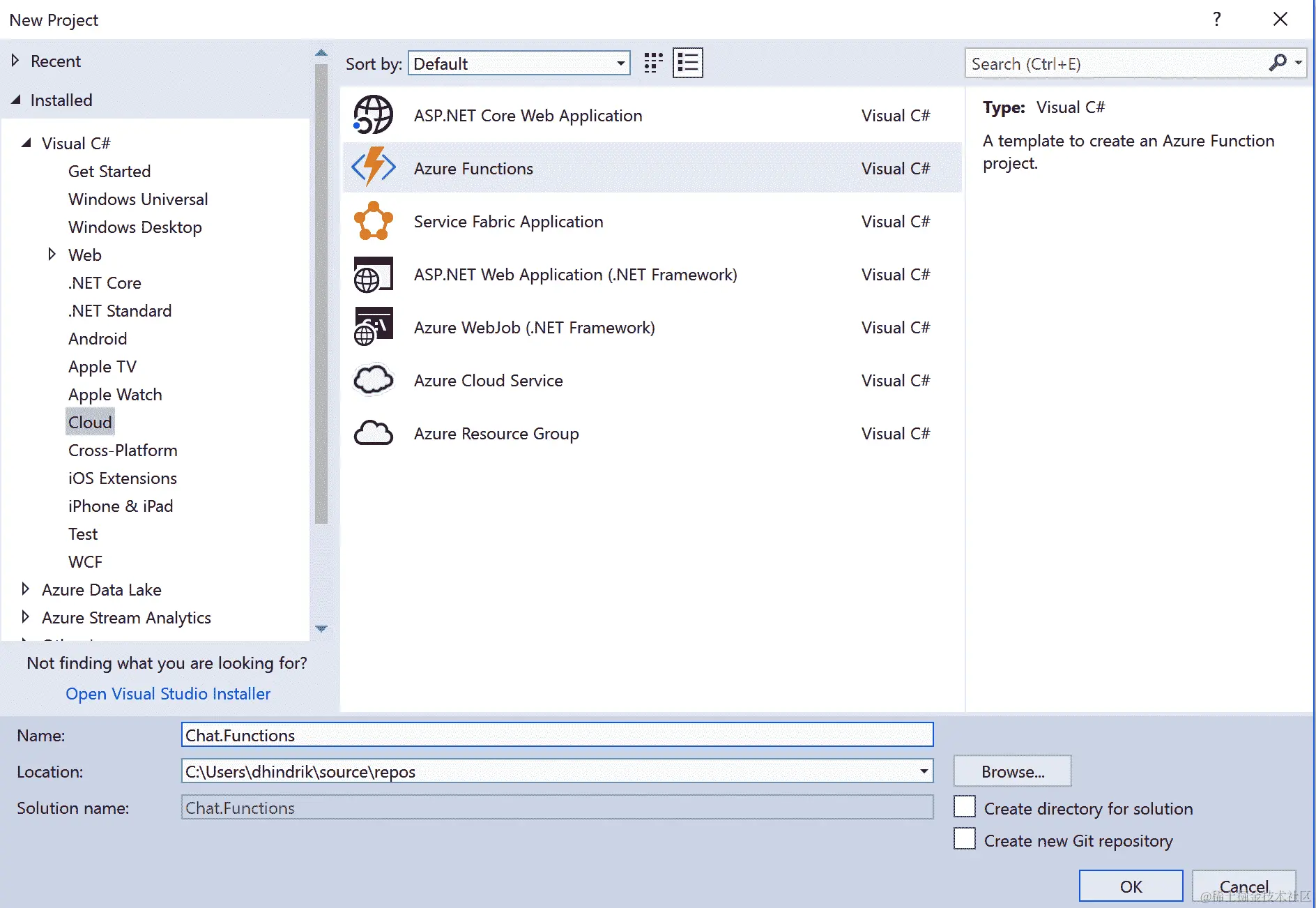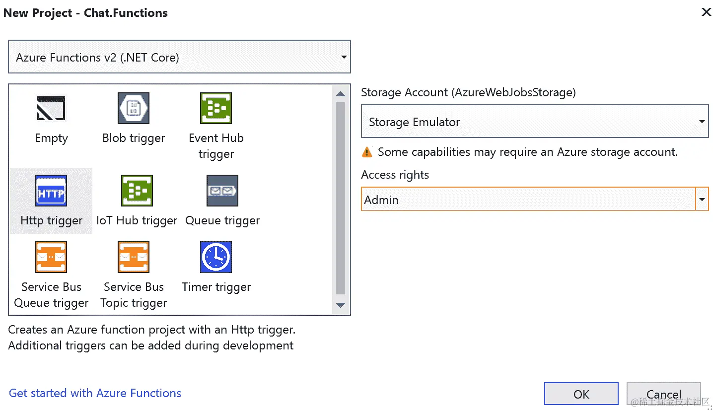 Chat.Functions项目,然后单击“新的 Azure 函数”,该选项将在“添加”菜单下找到。 -