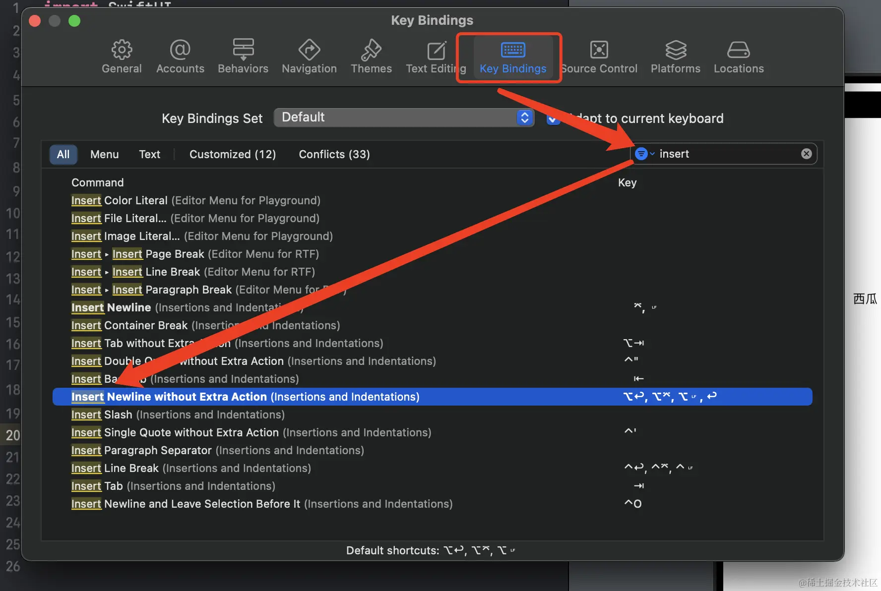 找到设置里面Key Bindings里面,右上角输入 insert 找到Inser newline without Extra Action,然后在后面的Key下面双击: