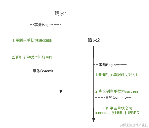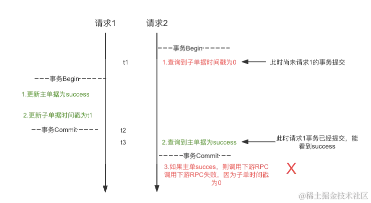 t3时刻,请求2由于RC隔离级别,能看到请求1的提交,主单状态为success,所以判定可以进行下游RPC的调用,但是由于在t1时刻获取到的时间戳为0,导致调用失败