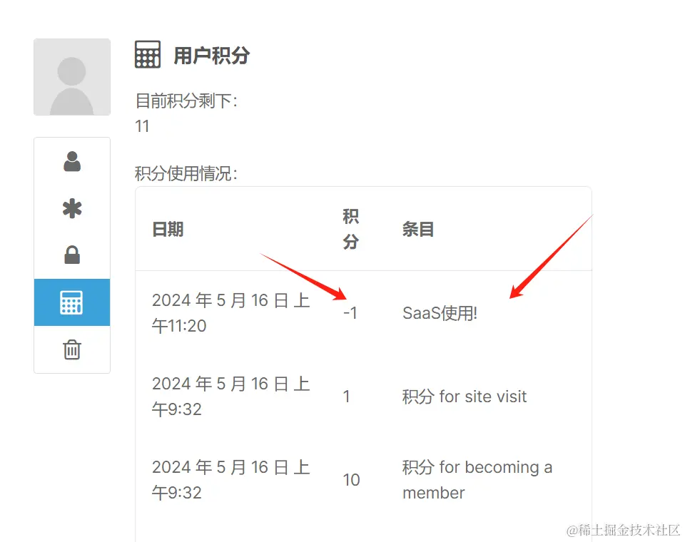 看,这么简单就实现了这么多功能,差不多完成微型SaaS了,下面再增加一点代码,在使用APP应用的时候扣减用户的积分。