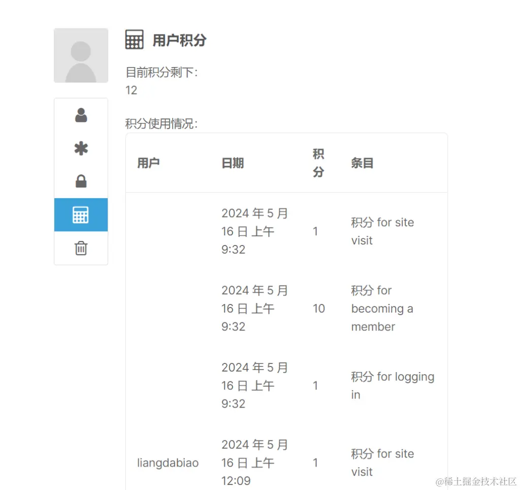 下载好这2个插件,我们就可以配置显示用户的积分情况: