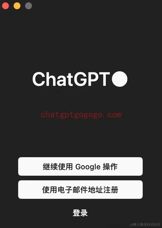 安装完成后,打开 ChatGPT 软件, 看到下面的登陆界面,进行登陆