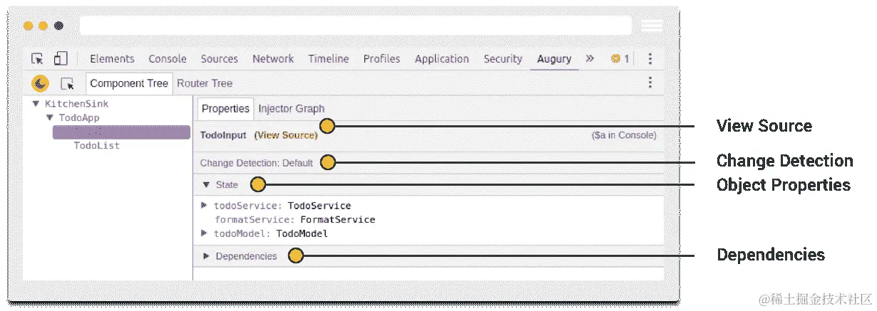 值得注意的是,要使 Augury 调试工作,应用程序必须设置为开发模式。
