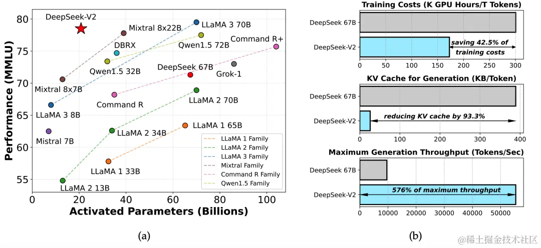 在技术报告的开始,Deepseek团队用多个数字和两张图直观地概括了目前模型取得的效果。模型参数量方面达到236B ,同时由于模型小专家混合的特性,模型在推理时的激活参数很少,可以实现高推理速度。在通用能力的表现上,模型在MMLU多选题benchmark上拿到78.5 分,取得了第二名,Deepseek-V2在众多开源模型中表现仅次于70B 的 LLaMA3,超过了他们此前发布的V1代67B的非MoE模型。在成本效率方面,相比V1的稠密模型,V2模型节约了42.5%的训练成本,减少了推理时93.3%的 KV-cache 显存占用,将生成的吞吐量也提升到了原来的5.76倍。借助YaRN优化的长度外推训练方法,模型的上下文能力得以扩展到了128k大小。下面我们结合代码和技术报告,对Deepseek-V2模型进行详细的解读。