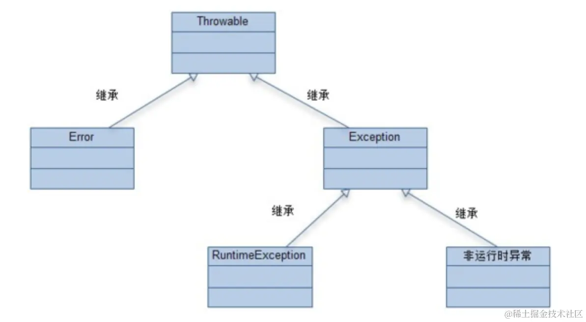- 异常:Exception以及他的子类,代表程序运行时发送的各种不期望发生的事件。可以被Java异常处理机制使用,是异常处理的核心。它又分为两大类:受检异常(checked exceptions)和非受检异常(unchecked exceptions)。
