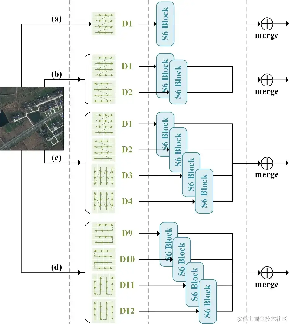 图2. (a) 平铺扫描策略,与Samba一致;(b) 平铺后进行正向和反向扫描,然后合并,与Vim一致;(c) 依次进行四个方向的扫描,然后合并,与VMamba一致;(d) 四个方向的蛇形扫描,与PlainMamba一致。