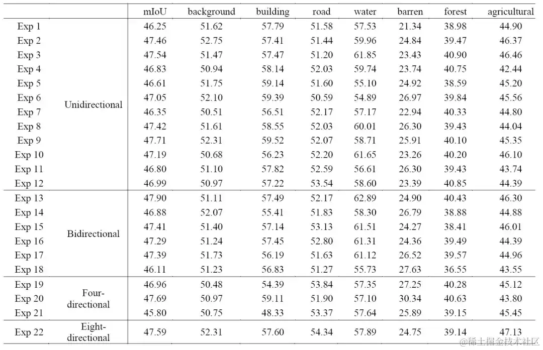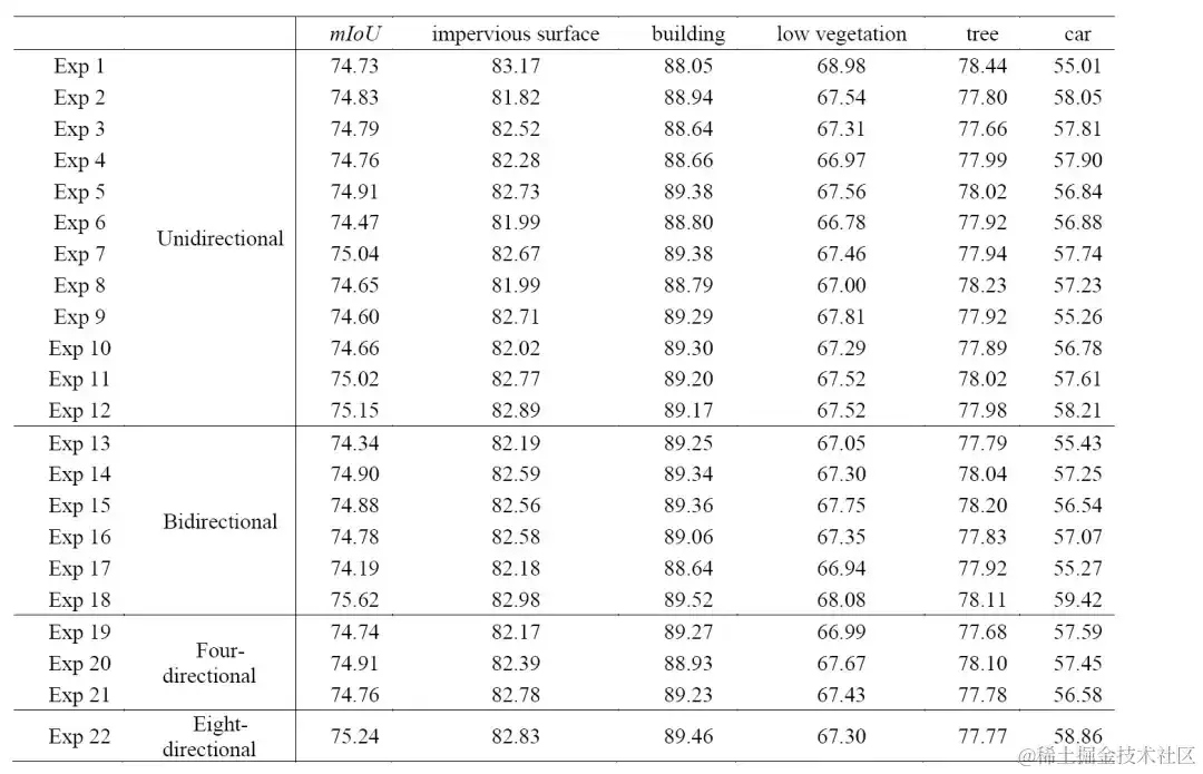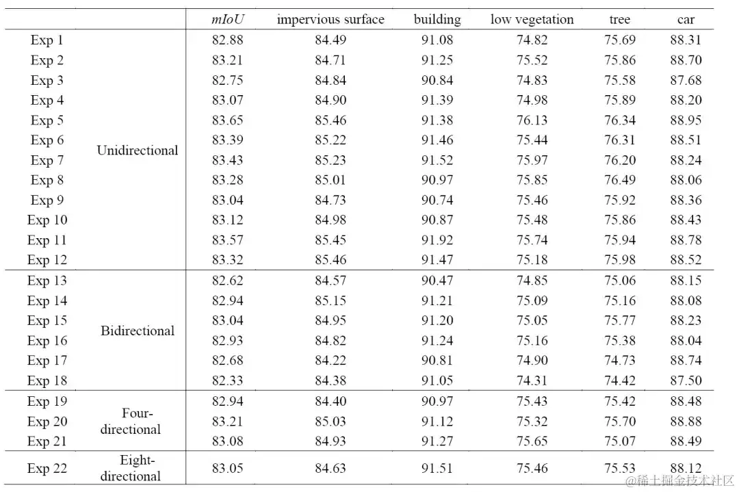 表1、2和3分别展示了使用图4中详细描述的22种扫描策略在ISPRS Vaihingen、ISPRS Potsdam和LoveDA数据集上的语义分割表现。我们在三个数据集中观察到一个有趣的现象:由22种扫描策略得到的分割准确率都是相似的。考虑到每个数据集中不同扫描策略之间的微小性能差异,以及单个扫描策略在三个数据集中的性能变化,没有明显的迹象表明特定的扫描策略在复杂性或涉及单个或多个扫描方向上优于其他策略。观察到的任何轻微性能波动可能都归因于训练过程中的随机性。基于结果的详细讨论以及未来工作详见论文。