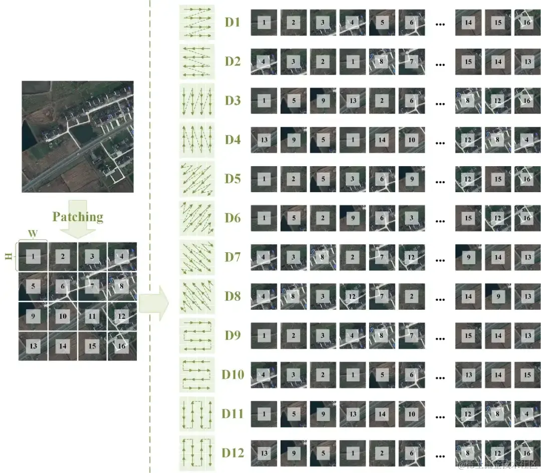 图1. Vision Mamba中常用的12种扫描方向。图像根据预设置的大小裁剪成patches,然后根据特定的扫描方向将这些patches建模为序列。