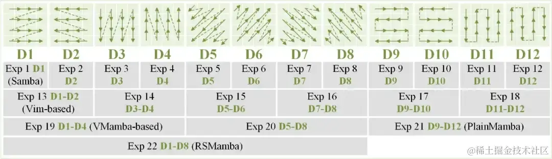 大量研究探索了新的扫描方向及其组合,试图增强Mamba对图像理解的性能。图1展示了12种常用的扫描方向(D1 - D12)。D1 - D4 是以“Z”字形模式顺序扫描图像patch的每一行或每一列。D5 - D8 是对图像patch进行对角线方向的顺序扫描。D9 - D12 则进行“S”字形蛇形扫描。然而,现有研究尚未全面比较其有效性。因此,亟需一项比较研究,定量评估各种扫描方向及其组合对Mamba在典型遥感任务(语义分割)性能的影响。