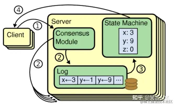 一致性算法基于复制状态机。