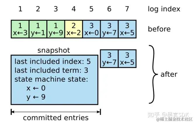 日志不能无限增长,Snapshotting(快照)是最简单的压缩方法。在快照系统中,整个系统的状态都以快照的形式写入到稳定的持久化存储中,那个时间点之前的日志全部丢弃。