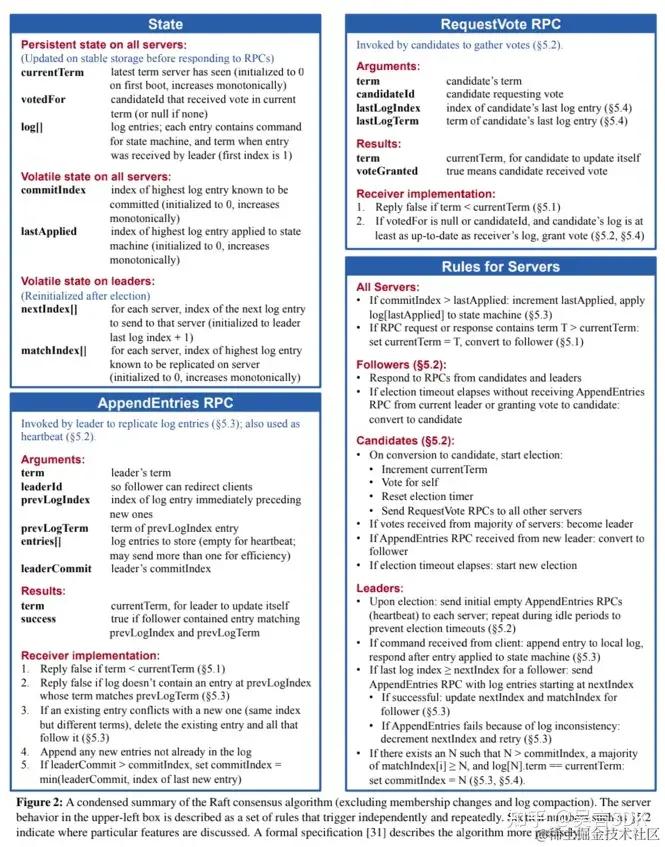 图2:一个关于 Raft 一致性算法的浓缩总结(不包括成员变换和日志压缩)