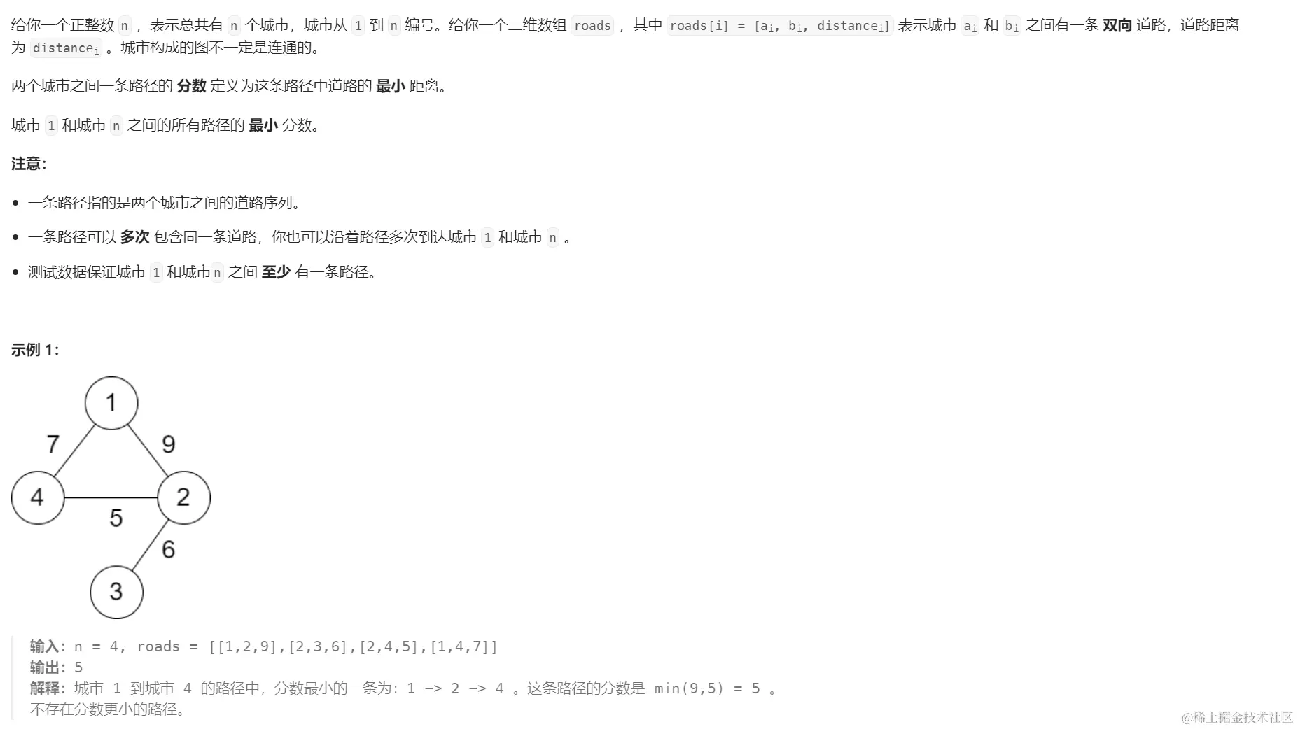 从编号为1的城市开始,把所有的连通城市都遍历一次,找出最小的距离即可。