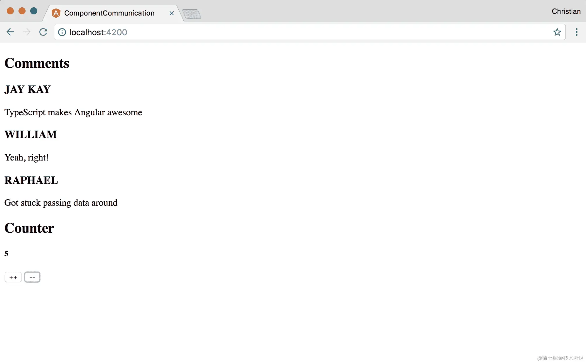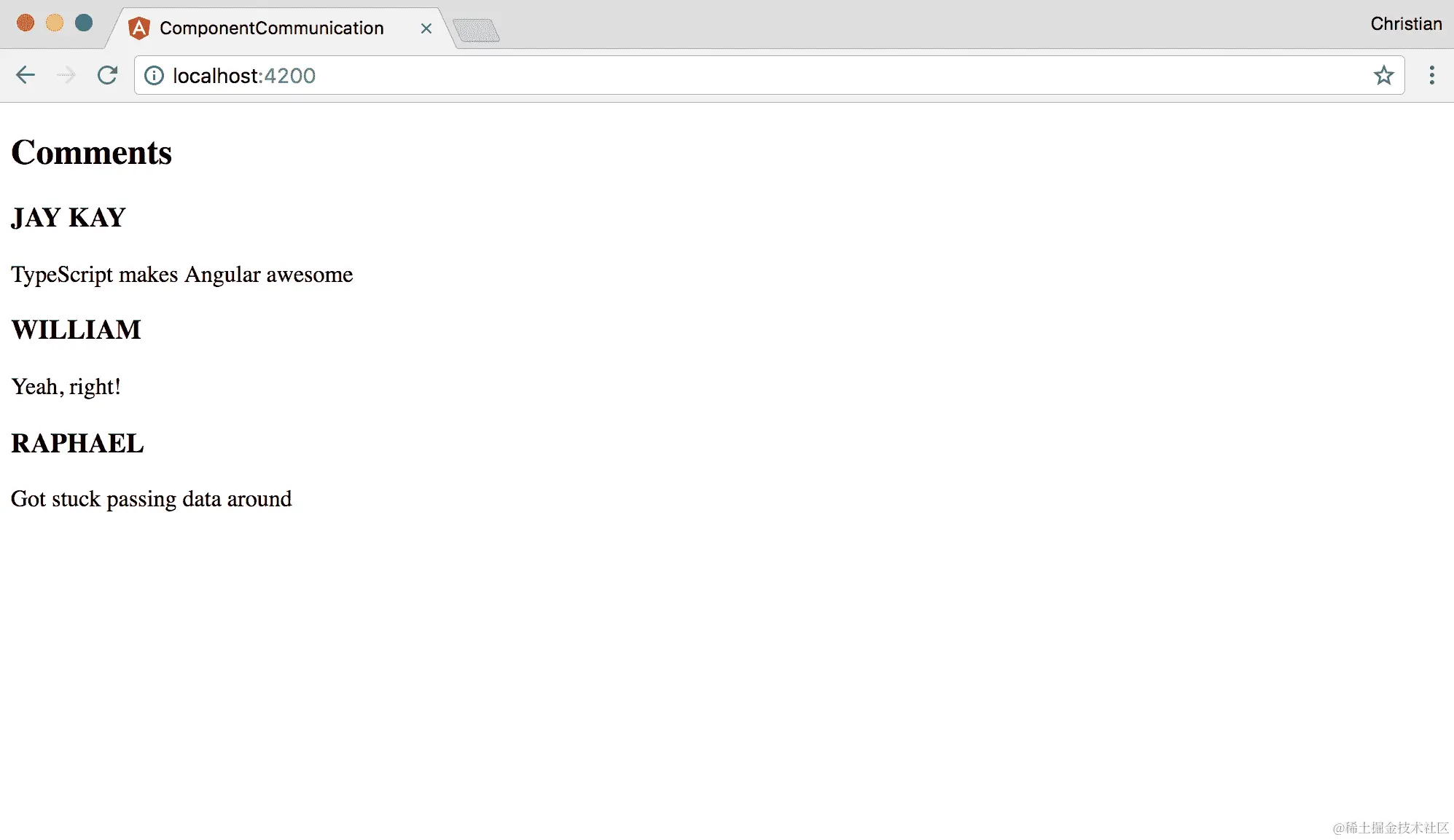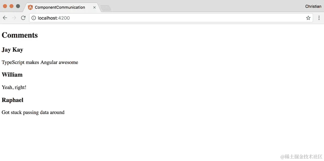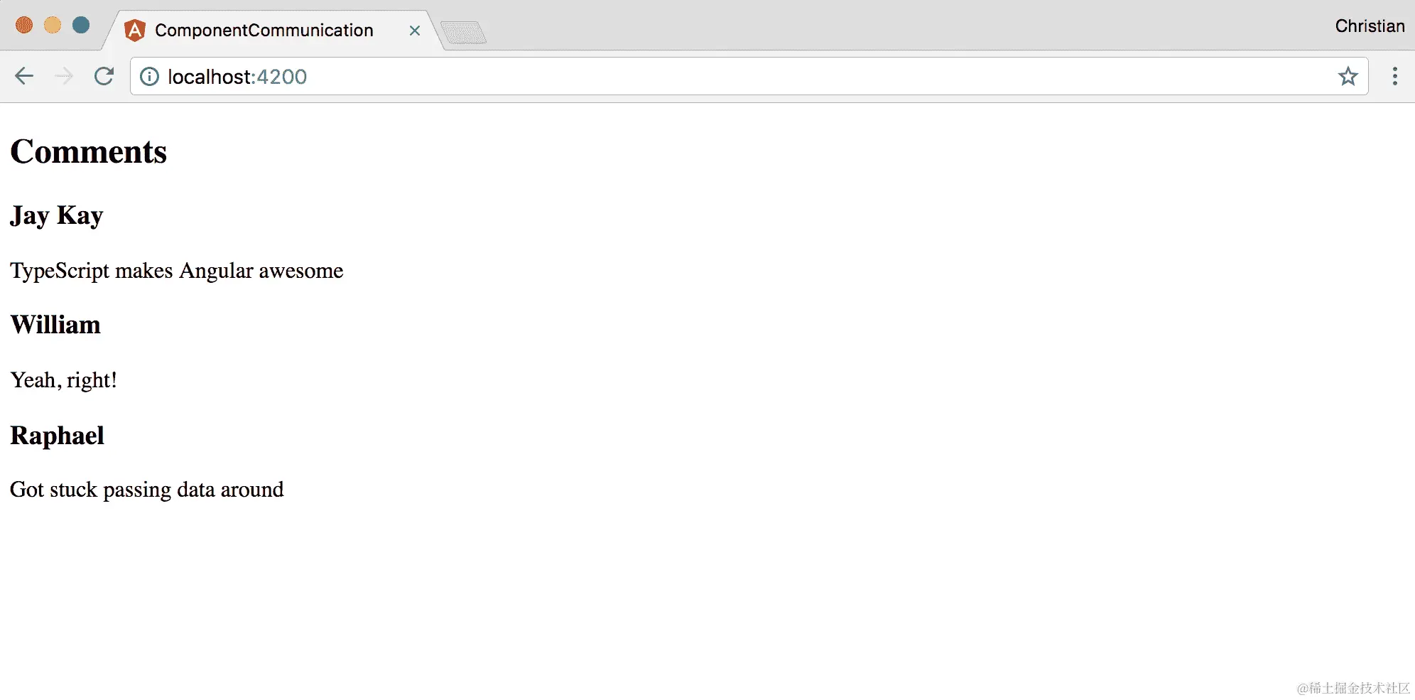 Input TypeScript 装饰器用于指定一个类属性将由父组件设置。因此,我们不需要在CommentListComponent.comments上设置任何值,但是我们需要等待直到通过AppComponent传递一个值给它。请记住AppComponent.comments也存在,因此我们可以使用属性绑定将AppComponent.comments传递给CommentListComponent.comments在app.component.html中: