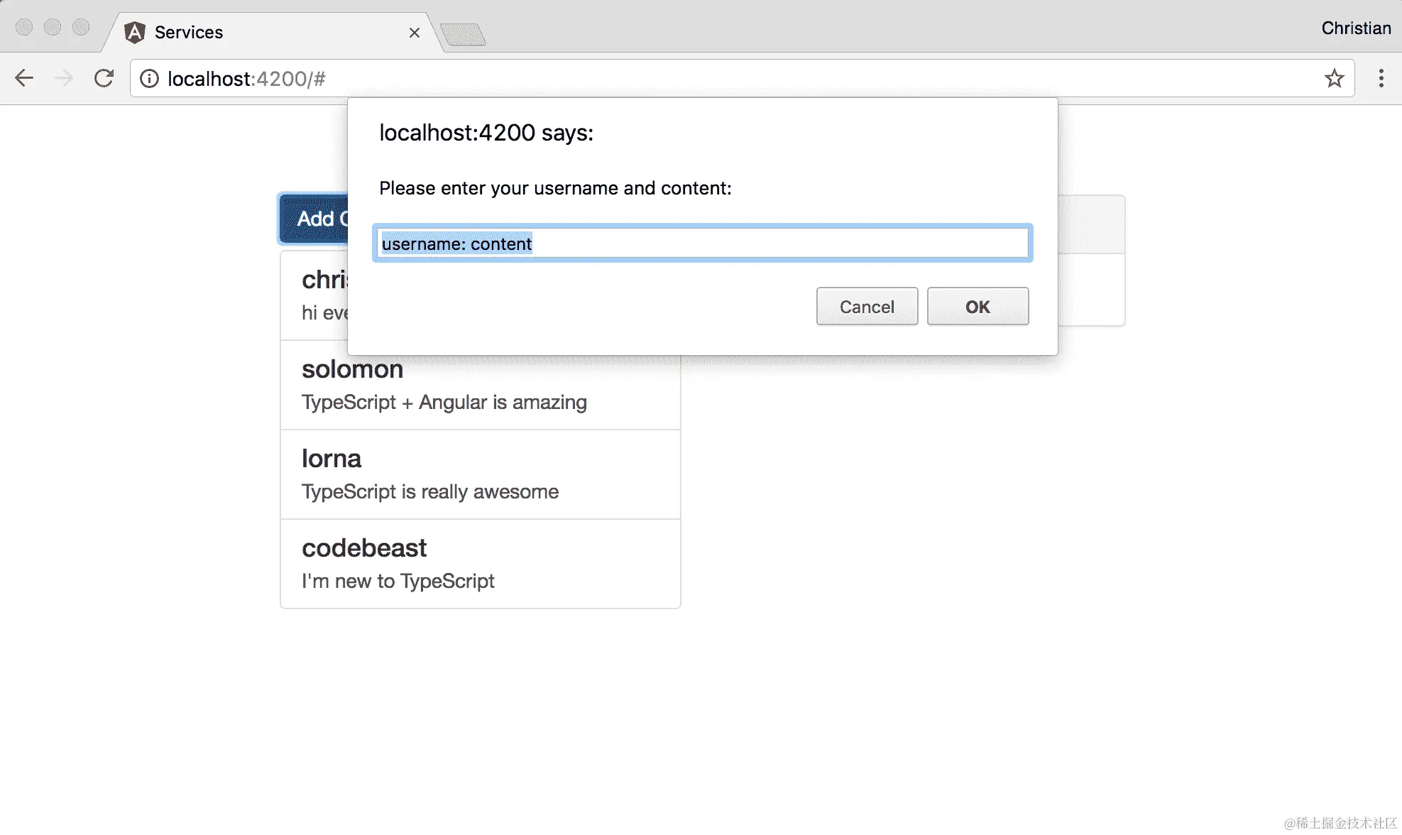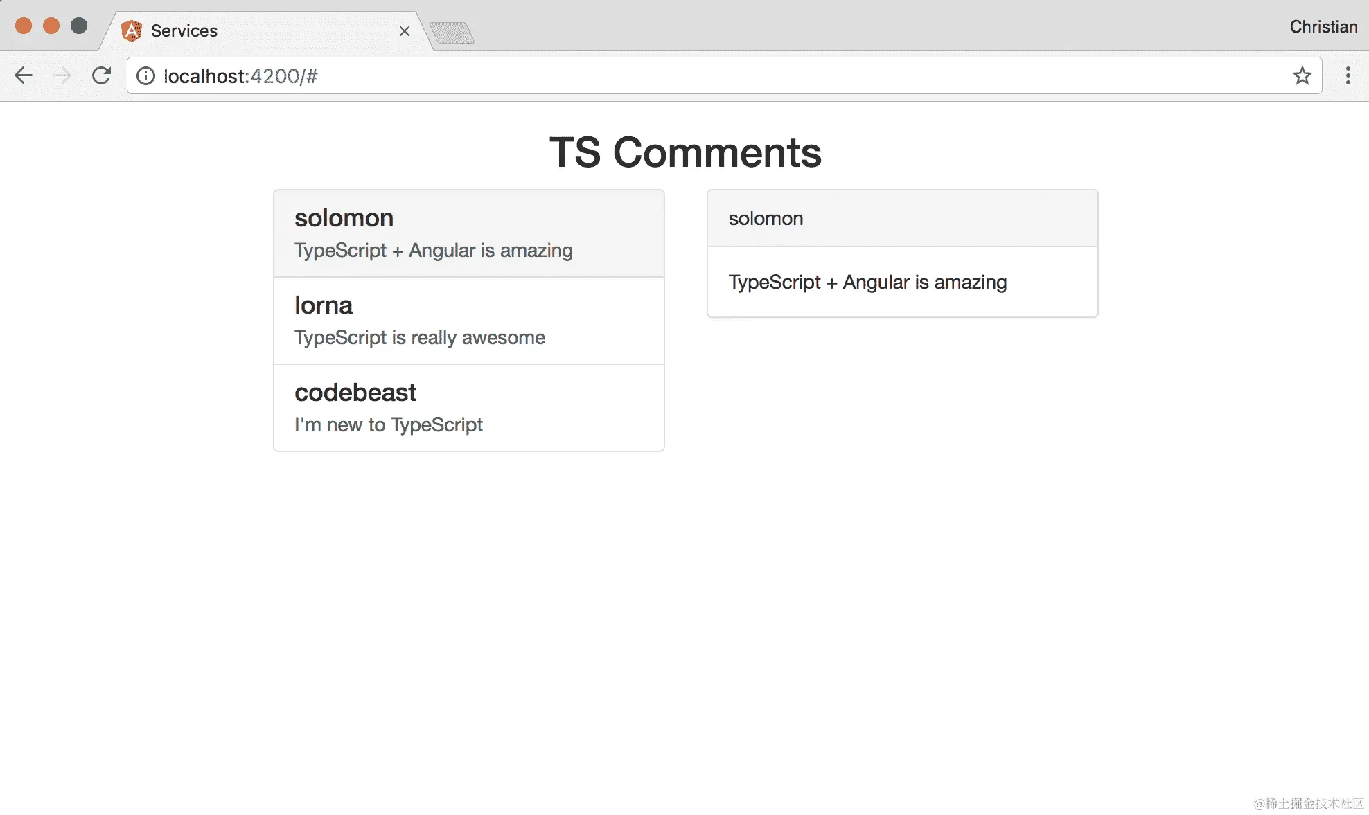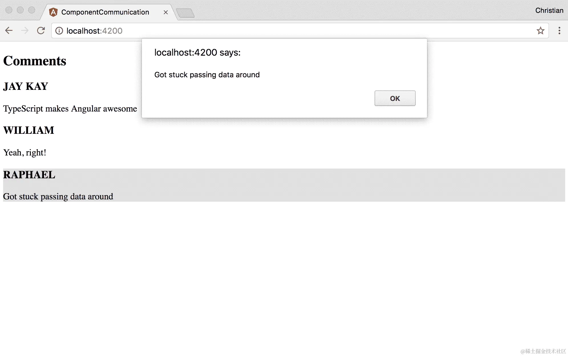 Input TypeScript 装饰器用于指定一个类属性将由父组件设置。因此,我们不需要在CommentListComponent.comments上设置任何值,但是我们需要等待直到通过AppComponent传递一个值给它。请记住AppComponent.comments也存在,因此我们可以使用属性绑定将AppComponent.comments传递给CommentListComponent.comments在app.component.html中: