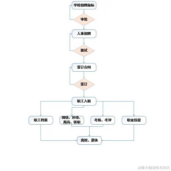人事部门处理学校人事信息,发布招聘信息到社会进行社招,针对面试可对面试人员进行系统登记留存档案,方便领导审核。完成面试审核针对入校得到教师需要对其进行岗前培训,入校培训了解其校园文化,校园规则。提交职工提交登记表,针对不同在校的教职工可对其进行学年考核,学期考核。