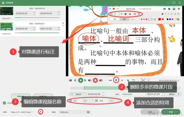 它可以输出多种格式的视频,包括MOV、GIF、MP4等,录制过程中,还可以使用软件提供的画笔、标注等功能进行实时编辑。以下是使用它录制微课的步骤:
