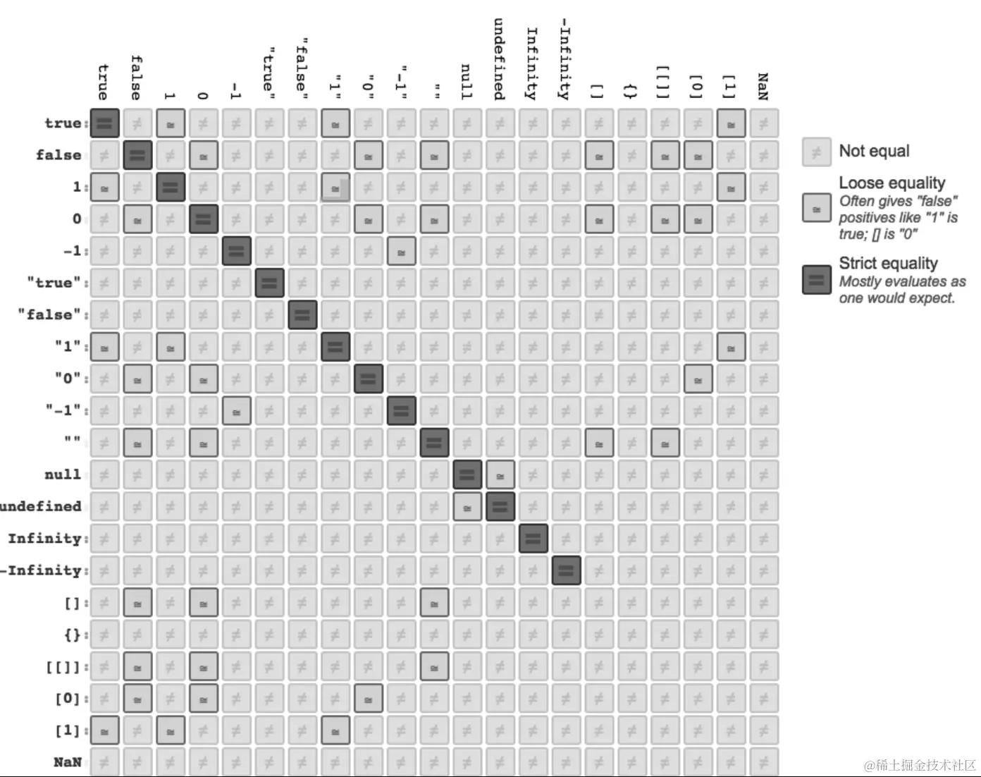 众所周知,JavaScript中的等值运算符是一个比较“复杂的玩意”,特别是在==运算符中,很多操作非常容易掉坑,在github上有为大佬,把Js中常用的等值运算做成了表格,大家有兴趣可以了解一下: