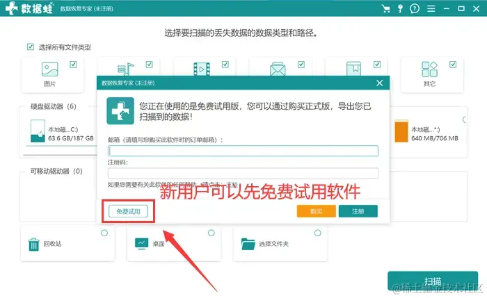 (1)确保下载最新版本的软件,并运行它,新用户可以先点击【免费试用】;