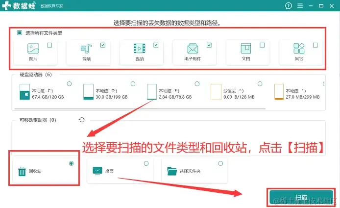 (2)进入主选择界面后,可以将需要恢复的文件类型勾选上(建议全选),再将 【回收站】勾选上,点击【扫描】 ;