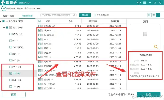(4)将需要恢复的文件都勾选上,再点击【恢复】,选择一个与原保存位置不同的磁盘来保存文件。