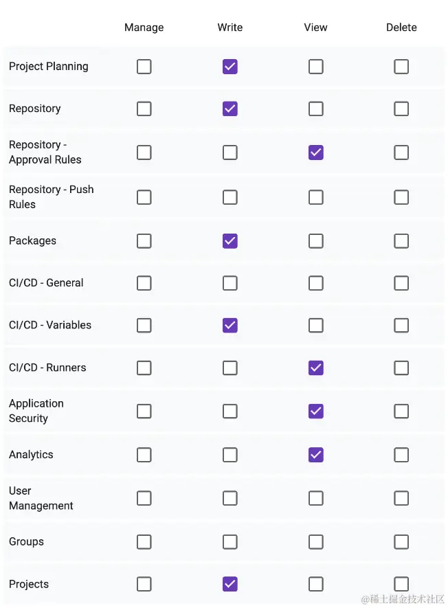下面是与软件包仓库相关的权限的具体示例。虽然该表是粗粒度的,因为它首先将所有软件包仓库类型分组在一起,但随着时间的推移,通过根据请求提取每个软件包仓库类型,该表可以变得细粒度。