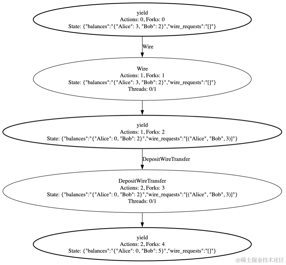 它发生在两个 actions 中。在第一个动作中,原子地记录电汇请求并从 Alice 的账户中扣除。在第二个动作中,再次原子地将转账标记为已完成并记入 Bob 的账户。