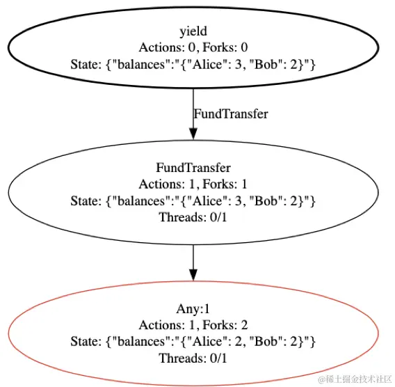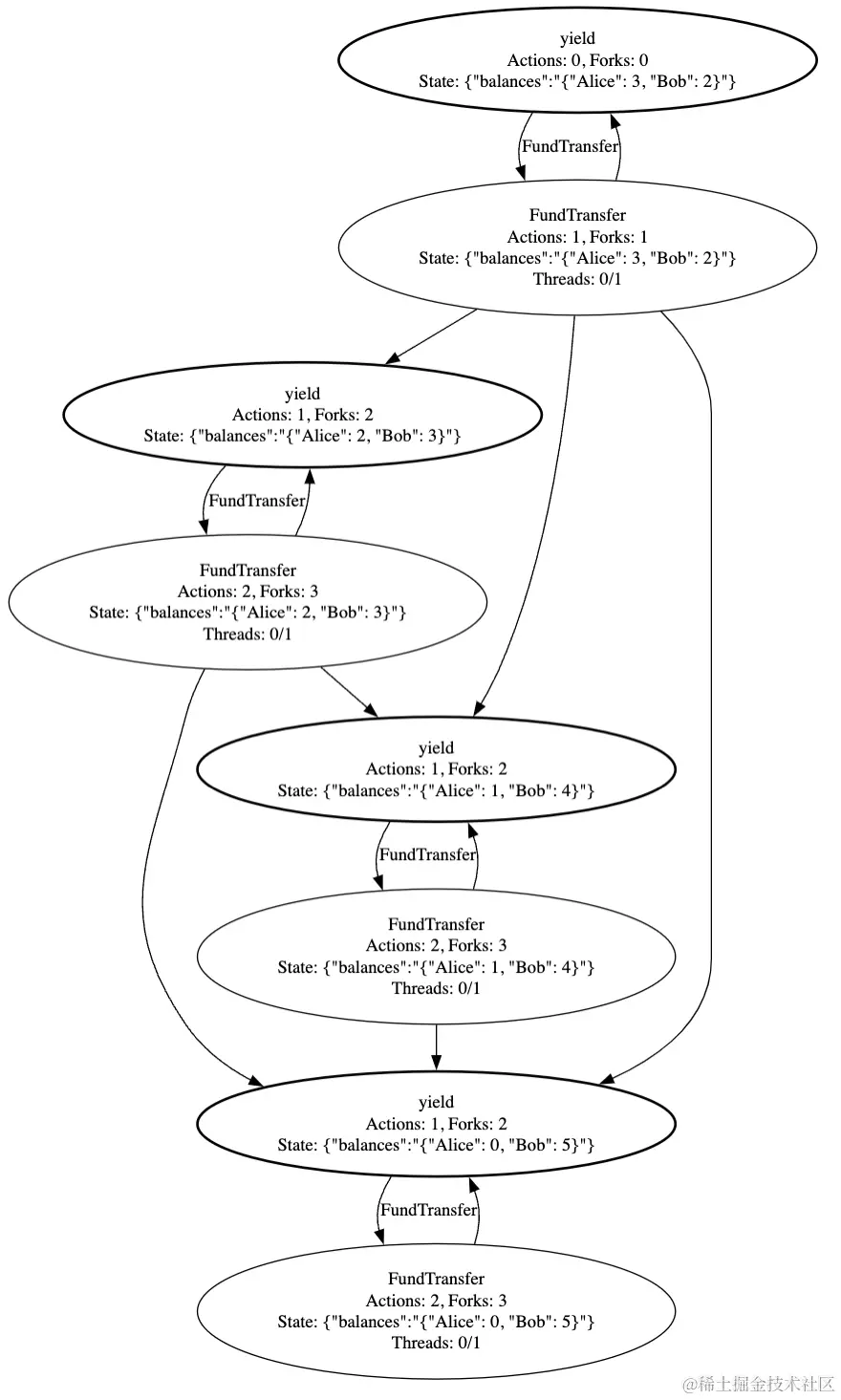 这是因为,当系统开始从 Alice 向 Bob 转账时,Alice 的钱用完了,系统无法取得任何进展。这是我们问题陈述中的一个问题,而不是模型或实现中的问题。我们可以通过允许 Bob 将钱转回 Alice 来轻松解决此问题。我们稍后会进行此更改。现在,为了简单起见,让我们做一个小技巧——添加一个不执行任何操作的动作。真正的代码永远不需要这样做。